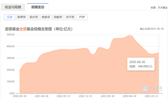 天天基金网数据显示,截至2025年二季度末,诺德基金的整体规模仅剩346.06亿元,较2024年6月30日的491.25亿元下滑比例超过30%。