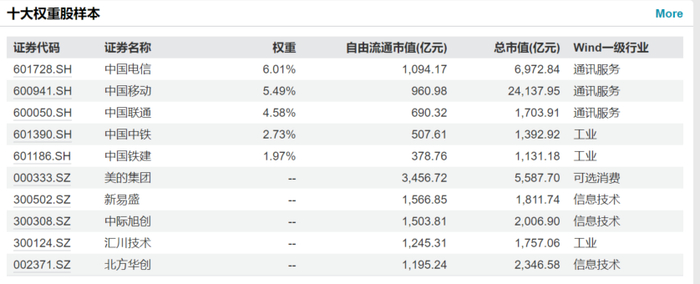基建指数(399995)前十大权重股不仅包括中国中铁、中国铁建这样的传统基建,也有中国电信、中国移动和中国联通这样的新基建。