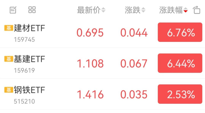 具体到投资层面,顺周期板块的估值逻辑已经从“弱预期-弱现实”转化为“强预期-弱现实”,底部区域已经逐渐清晰,配置的“赔率”性价比正在凸显。其中,建材、基建、钢铁等板块有望直接受益于“超级工程”的落地投建,业绩和估值均存在较大的扩张空间,感兴趣投资者可关注建材ETF(159745)、基建ETF(159619)、钢铁ETF(515210)等。