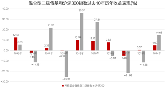数据来源:Wind,统计区间:2015.1.1-2024.12.31。指数过往收益不预示未来表现,不构成指数基金收益的承诺或保证。市场有风险,投资谨慎。万得混合债券型二级指数代码为885007.WI,沪深300指数代码为000300.SH。