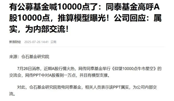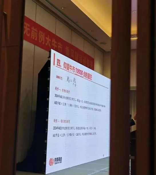 近期A股行情火热,网传同泰基金举行《仰望10000点牛市星空》的交流会,网传PPT中对A股看到一万点,并且有模型支撑。