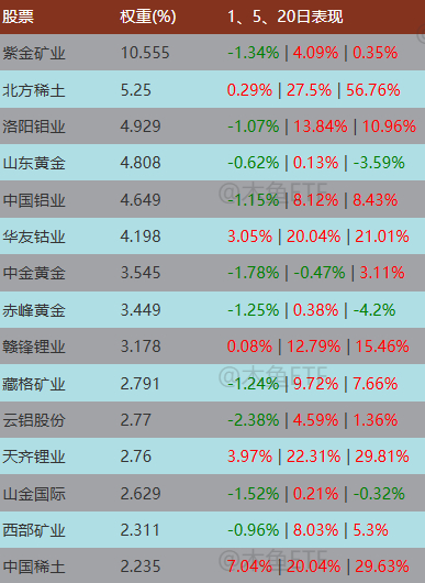看下有色金属的成分股表现,黄金部分是拖后腿的,新能源金属、稀土是带节奏的,工业金属大致向上。有色金属ETF有四大分支,总计上比别的主题更为稳健。
