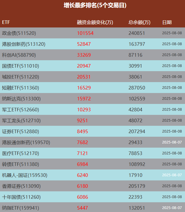 融资增加的ETF中,可见债券类数量大增,这个表明有活跃资金从A股切换到债券短期待机。人气方向创新药、科创AI、军工、证券、机器人等上周也保持流入。不过香港证券从前面几周一直大幅流入对比,现在其实弱了。