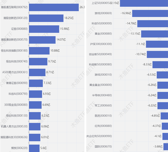 创业板、沪深300、科创50、银行、港股科技类、黄金主题赎回量加大。