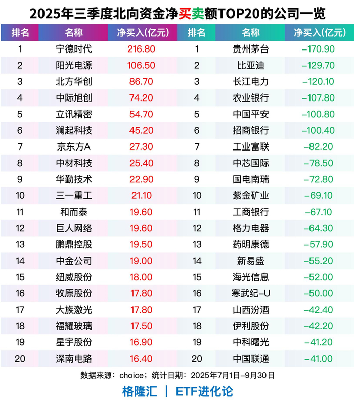 北向资金三季度净买入金额前十的股票分别为宁德时代、阳光电源、北方华创、中际旭创、立讯精密、澜起科技、京东方A、中材科技、华勤技术、三一重工,净买入金额依次为216.80亿元、106.50亿元、86.70亿元、74.20亿元、54.70亿元、45.20亿元、27.30亿元、25.40亿元、22.90亿元、21.10亿元、