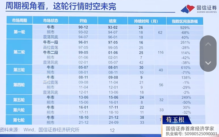 5、从1990年起算,A股总共有7轮牛市。我们这一次从时间、空间来讲,行情持续的阶段还不够。