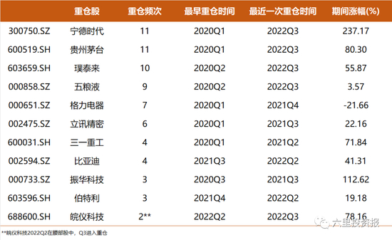持有期限较长的有宁德、茅台、璞泰来、振华科技等,多只个股持有涨幅都在100%以上,且能跑赢各自行业指数,整体胜率较高。