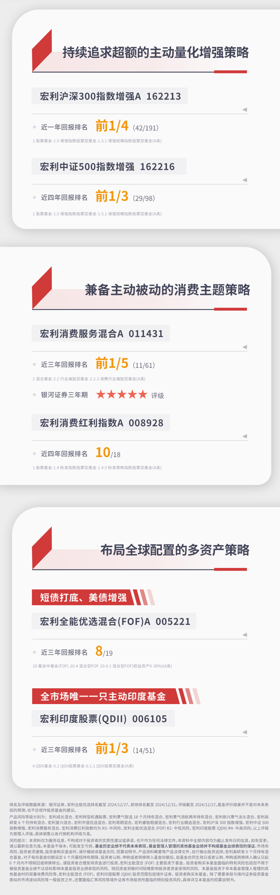 2025年,我们认为上半年市场的关注点将转向国内政策和需求,周期性低估值的大盘红利资产,特别是在金融和泛周期板块中寻找投资机会,以实现为客户带来长期稳健的收益。