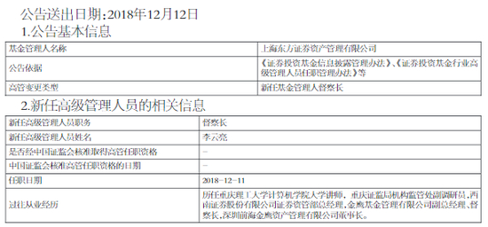 新浪财经讯 12月12日消息,东方红资产管理公告,新任李云亮为公司督察长,同时总经理任莉女士自2018年12月11日起不再代行公开募集基金管理业务合规负责人(督察长)职务。