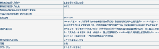 资料显示,孙万龙,2005年6月至2011年2月就职于平安养老保险股份有限公司,负责云南分公司年金相关业务;2011年2月至2012年8月就职于博时基金管理有限公司,负责机构客户开拓及维护工作;2012年9月至2015年6月任职华安基金管理有限公司,担任华南机构负责人职务;2015年6月至2018年7月任职富荣基金管理有限公司,担任副总经理职务,负责产品、市场营销、销售、信息技术、基金运营等部门;2018年11月加入同泰基金管理有限公司,2018年12月起任公司副总经理,分管市场销售部及产品开发部。