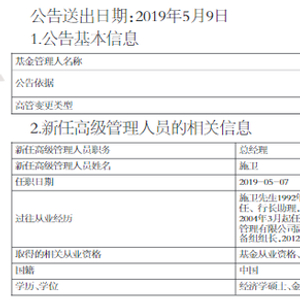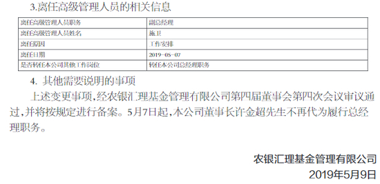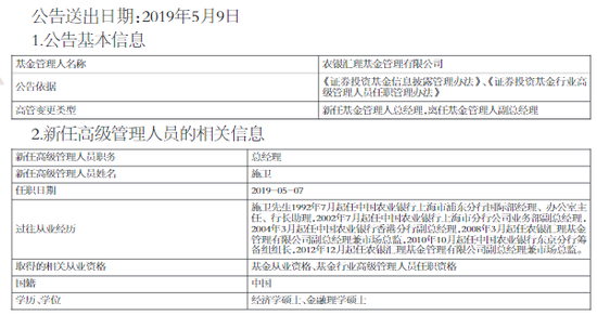 新浪财经讯 5月9日,农银汇理基金公告,副总经理施卫升任总经理职务。