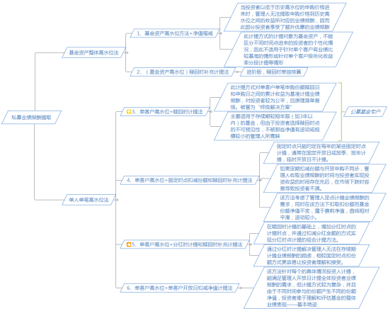 该方法针对每个的具体情况投资人计提,能满足管理人开放日计提全体投资者业绩报酬的需求,但计提方式较为复杂,并且由于不同时间参与的份额产生不同的份额净值,投资者难于理解和评估基金的整体业绩表现——目前国内托管技术上和渠道配套没有全部到位,但国外这种方法比较盛行。