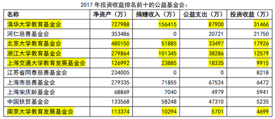 再次,公益基金会投资能力出现较大的差异,投资收益排名前十的公益基金会有一半是大学教育基金。投资收益较高的高校基金会通过资产配置投资于银行、信托、券商、公募、非公募,凸显了专业投资的优势。