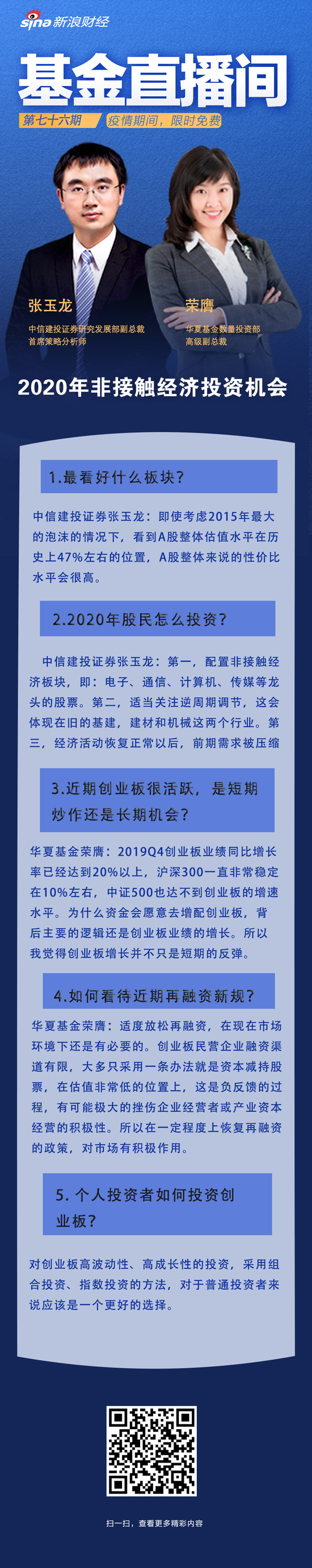 从现在看未来5G的建设将会带动上游电子产业的很多机会;5G建设建成以后,会使得云计算这些板块的5G应用,包括大家看到AR、VR、传媒领域等非接触的经济,将来它就会改变我们的生活。比如下次我们再和华夏基金一起讨论的时候,每个人都戴一个AR、VR的眼镜就像坐在一块讨论一个问题,这种身临其境的感觉也是不一样的,这是科技创新带来的很重要的方向。