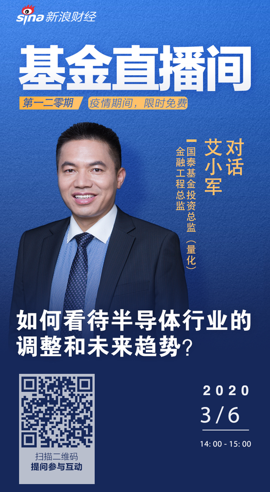 艾小军:很高兴又有这个机会跟大家做一个交流,因为这个疫情的原因,大家都是弹性工作,包括出差都不方便,所以我们也加大了这个平面,通过新浪基金直播间这个平台跟大家做交流,这是我在这里跟大家第三次还是第四次的交流。中间有过比较大的一个波折,尤其是我们今天的主题,半导体如何看待近期的调整以及未来我们怎么看,尤其是在春节之后的那一周,包括半导体在内的这些科技股走得比较快的候,介入的一些投资者朋友可能目前非常关注的一些问题,我们来跟大家再交流一下。