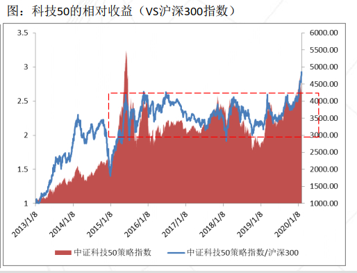 创业板指作为一个科技板块的整体,它里面有各种各样的东西,比如养猪的也在里面,做一个规模指数是没有问题的,但是精挑细选的科技公司它的表现会更好一些。所以大家能发现科技公司它的整体表现相对创业板指,蓝色这根线持续往上走,说明什么呢?说明好的科技50可以持续的跑赢创业板指。所以这是我们说科技公司相对创业板指也会更优的,虽然说2020年我特别看好创业板,但是整个市场里面如果精挑细选,大家会发现创业板效果没有科技50更好,所以科技50作为细分品种表现会更好一些。