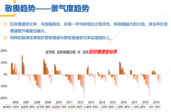 我们一定要敬畏市场趋势,影响A股市场核心的一点就是钱来了一定是要流到一些景气度高的方向。这张图我给大家做一个简单的解释,这张图告诉你A股市场的方向,我可以告诉你包含了大盘股、小盘股,所有板块强势的地方,包括有人在问的一个问题,科技50的情况,都在这张图里面,这张图是什么呢?这张图是上市公司当年的企业盈利和股票的涨跌幅之间的相关性。大家可以去这么理解,这是2006年,十几年前了,这里是2007年,12年前了,这个柱状图都是呈现往下了,业绩最好,当年的涨跌幅最好,都呈现这样一个相关性。这就告诉我们,如果说某个板块当年业绩在所有行业里面领先,那么它整个板块的回报率会更好,这是一个比较通俗的道理,很多人都懂。但是我们投资的时候是不是真的这样操作?因为我们好多人今年超周期,你想一想如果把这张图拿下来仔细考虑一下,今年的景气度能不能改善?我告诉你,其实很难,这是驱动整个A股市场的核心点。