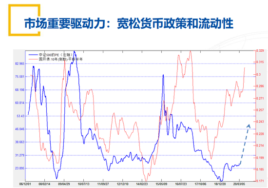 比如说大家会发现我放的第一张图是什么呢?这两根线我给大家做个解释。第一根线大家看蓝色的线,这是A股市场的估值,你可以把它看成PE,它就是PE的TTM。红色那根线是什么呢?那根线是我们国家的一些国债利率,做的导数。这个红色线往上涨就代表货币政策的宽松,那么货币政策的宽松它会带来一个什么情况呢?大家会发现货币政策的宽松每一轮都会带来整个估值的修复。