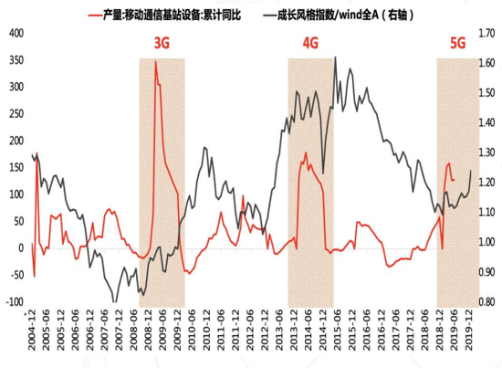 这张图是中国3G、4G、5G区间里面A股市场的一个风格。这张图里面阴影部分是3G、4G的区间,包括移动通信基站设备的累计同比,灰色线是什么呢?灰色线就是市场的风格,称为科技风格或者成长性风格它相对大盘的一个表现。