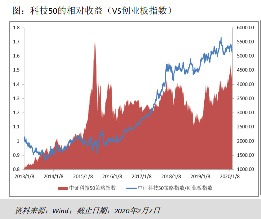 比如说这张图里面细节变化是什么呢?就是科技50它整体的历史表现和创业板指的差别。