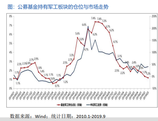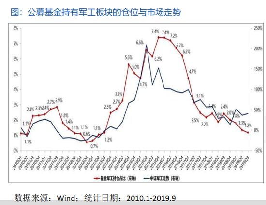 军工为什么会相对机会大一些呢?我给大家看几张图。第一军工现在是机构配置的比例最低的一个板块,军工现在估值处于最低的领域。 这张图是军工板块整体的配置情况,大家会发现这里面有两根线,红色这根线是机构,你可以理解成机构投资者买的军工的情况,现在是历史最低点。