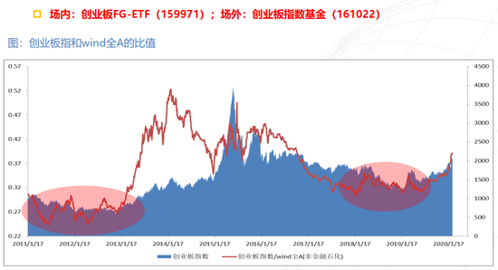 再加上国内创业板的节奏也经过了一个充分的调整,这张图也很有意思,我也特别喜欢,经常拿出来看。这张图代表的是中国广大散户,代表了中国广大机构投资者,以及代表所有的投资者在整个股票市场的一个交易行为。这张图我用两个方框圈出来,这是我们的创业板指除上我们的大盘的一个走势,上一轮创业板强对大盘走弱是什么时候呢?和我们的再融资结构非常吻合,从2010年一直熊到2012年底,经过充分的换手,充分的调整,再融资政策收紧,你会发现整个市场里面创业板走的很弱,紧接着2013年、2014年、2015年创业板走的很强,你会发现这一轮是再融资政策的逐渐放松。而我们现在处于什么位置呢?我们现在处于创业板经过三年之后的充分换手,杀估值,杀盈利,现在处于整个政策的放松期,不但货币政策现在比较宽松,美联储已经大幅放水,你会发现美国利率大幅度放松,中国的利率也出现大幅度放松,所以利率在下行,第二个再融资政策现在也放松了,第三个整个行业景气度在上行。所以你会发现整个创业板指相对于大盘的走势出现了一个持续往上回升的走势,而且这个回升是相对大盘,是在前期经历了充分的洗礼之后往上修复,所以这就支持我们今年市场里面整个创业板其实是一个主流,所以在去年的时候我们公司也发了创业板的ETF,叫创业板FG。从我们发行到现在一路上涨,现在净值在1.5块上下。这是我们对市场的一些判断,以及在这个判断之下我们发的一些产品,叫创业板FG(富国创业板ETF[159971])。