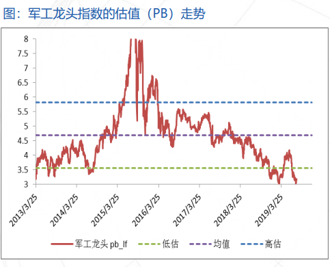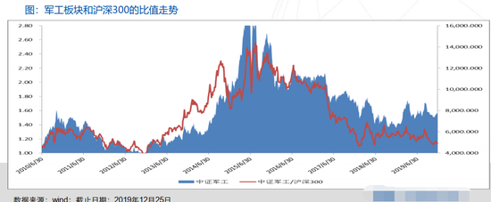 现在军工是什么样的情况呢?现在的军工就特别像去年年初时候的创业板。这张图大家怎么理解呢?这张图是军工板块除上大盘沪深300走势,上一轮2010年-2012年和2013年年初,军工持续跑输沪深300,这样一个过程,经过充分换手。现在在什么位置呢?现在也是经历2-3年的充分换手,前期是跑弱、换手,后面可能有机会。所以从这个角度来讲,军工板块现在换手也很充分,只是由于过去几年伤了太多的人,现在很多人对它很怕,但是你会发现现在军工板块换手比较充分,估值也到了非常低的位置。