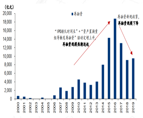 我们可以看看中国再融资一个变换的节奏,大家可以看这张图。(图)这张图很重要,大家只要把这张图放在旁边,对我们做长期投资或者做一些资产配置方向可以提供非常好的帮助。大家会发现,这张图是再融资的一张图,你会发现有两个节奏,第一个是2010年-2012年回落,从2013年、2014年、2015年往上,从2016-2019年回落,是这样一个过程。