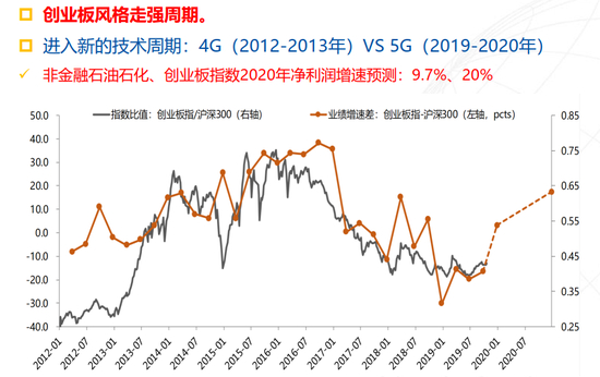 这张图告诉大家什么呢?这张图告诉大家,橙色这根线是创业板的业绩减沪深30的业绩差,这是整个上市公司的业绩差,但是会发现这个业绩差呈现一个V字型,这是2020年的情况。那么整体看下来,整个创业板业绩通过2016年持续的下杀,一直松,一直杀,杀到什么时候呢?杀到了2019年的时候,2018年年底,2019年的时候开始回升,你会发现整个业绩出现往上走。所以相对来说创业板的业绩比沪深30的业绩今年要好。
