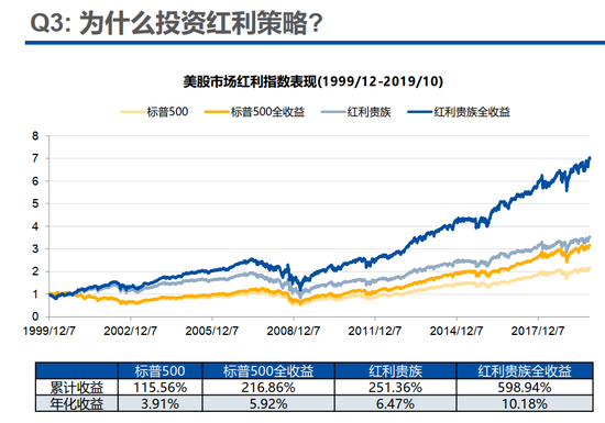 另外还想让大家关注的一点,这张PPT上还说明了一点什么呢?还说明了红利贵族它整体的这两条线都是在上方的蓝色线,都跑赢下方的橙色线。也就是说,拉长到一个比较长的时间阶段来说,你投资这一类红利类的策略,它整体收益是高于你买一个比较简单的标普500指数,这也是为什么像红利类侧率一直在国际上也非常有生命力。就是因为大家发现这个确实能带来一定超越市场的超额收益的这样一个策略,这是这张PPT上要给大家呈现的一个结论。