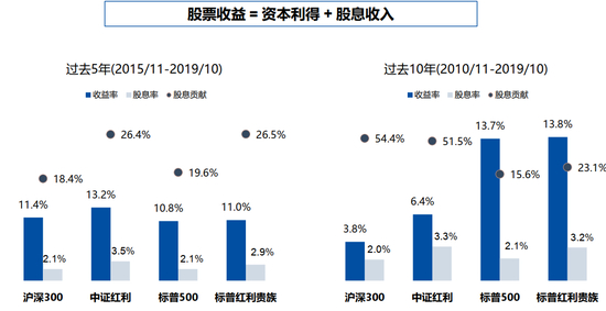 接下来我们再看一下,刚才这个是在时间轴上看到的一个情况,我们现在来看一下在另外一个层面上看到的情况,我把每一个指数都横向对比了一下,看看在A股市场上是怎么样的一个水平。我统计两个不同的区间,股票收益我们可以拆成资本利得+股息收入。资本利得就是大家看到帐面上的浮盈浮亏,所谓的股息收入就是上市公司分红,虽然它股价回落,但是你拿到了现金,就相当于是一个比较稳定的收入,所以我们把股票收益拆成这两部分。过去五年,从2015年一直到2019年的时间周期,比如沪深300它整体平均年化收益率特别高11%,11%收益里面股息率大概是2%,2%除以11%接近18%的水平,也就是说沪深300全收益指数上涨有18%是来自于股息收入。
