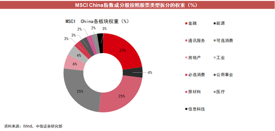 用一个海外投资者最常用的指数MSCI China作为配置中国的基准指数,去看中国在海外或海外投资者配置的股票池里面的成分,可以看到,指数里面75%是来自于三个板块: