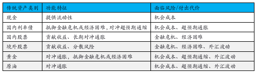 不同资产在投资组合中有不同的功能,例如股票资产是投资者参与经济增长并获取长期回报的主要方式,因此功能在于贡献收益和对冲通胀;例如利率债是对冲通货紧缩最主要的工具,此外也将抵御金融危机或经济困难;例如大宗商品是对冲通货膨胀的合理工具,而黄金即使在通缩情况下也可能表现较好。