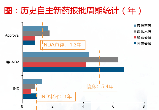把报批周期分拆来看,历史上获批的这些自主新药:1)审评阶段,包括IND和NDA审评,平均耗时约为2.3年左右;2)临床阶段,平均耗时约为5.4年左右。随着2016-2017年药审提速:1)审评阶段,有望压缩到1.3年左右(IND审评60个工作日,NDA优先审评1年左右);2)临床阶段,有望压缩到4年左右(过去新药临床往往需要按照I期、II-III期分开申请批准,现在为I-III期大临床批件)。这也就意味着,自主新药报批周期将被压缩到5年左右,报批周期大幅缩短。