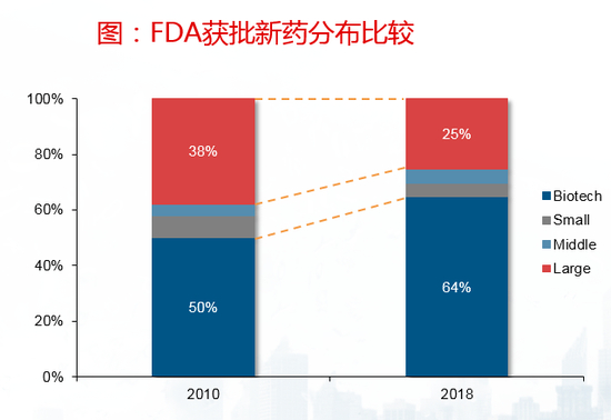 在2018年FDA批准上市的59款新药中,64%的新药最初的研发活动起源于新兴biotech公司,这些biotech在最近一年全球年销售额低于5亿美元,研发投入低于2亿美元,大型医药公司自主研发药物数目占比仅为25%。
