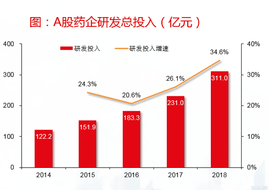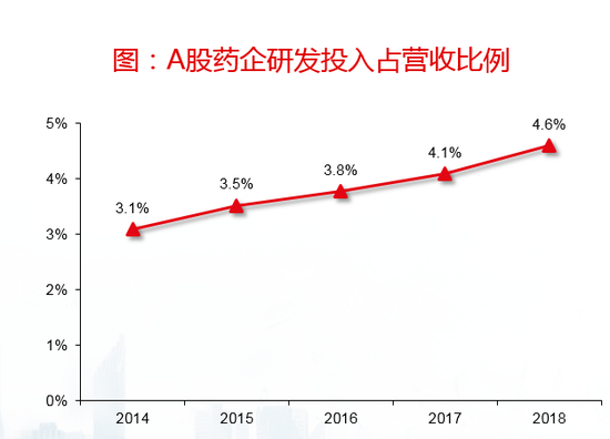 研发投入是医药行业迈向创新非常重要的先行指标。随着国内制药产业不断崛起,近年来A股制药企业的研发投入呈现持续增长态势。2015年到2018年,A股制药企业的研发总投入从151.9亿元,增长到了311.0亿元,呈现出加速增长态势;研发投入占营收的比例,也从3.5%增长到了4.6%。