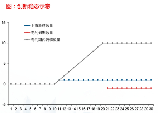 为此,我们提出“十年创新稳态”的概念来演示。假设一家大型跨国药企:1)平均每年能够有1个创新药获批上市;2)每个新药的平均研发时间为10年;3)到第20年,每年开始有1个创新药专利到期。那么,如果想达到同时有10个创新药在售的稳态阶段,需要在长周期中保持着良好的研发产出率。