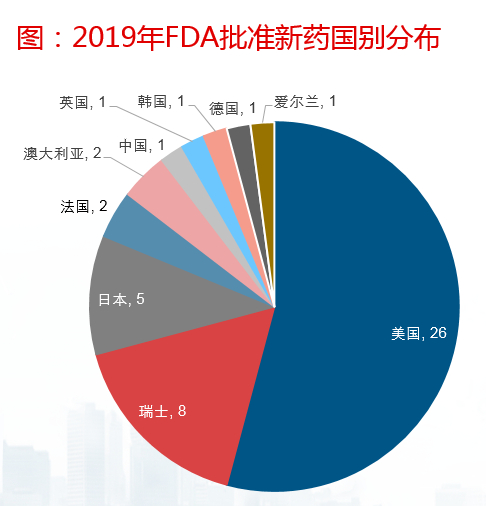 全球对比来看,2019年,FDA批准了48个新药,其中美国公司产品达到26个,其次为瑞士公司的8个和日本公司的5个。从数量上来说,中国创新药产业已经处于第二梯队,未来几年有望向美国发起冲击。