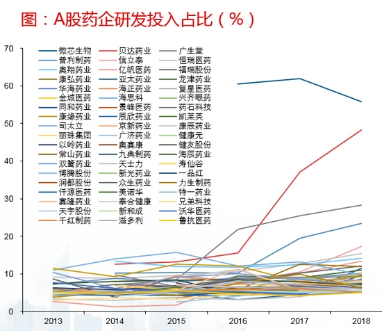 从研发投入强度来看,目前A股研发投入占营收比重超过5%的制药企业,已经接近60家。其中多家大型药企的年研发投入金额,都已经达到了5亿元以上的量级。