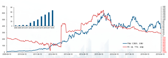 以阿柏西普所有者再生元公司为例。再生元成立于1988年,但直到阿柏西普获批上市后,、才逐渐扭亏为盈,市盈率到2012年转为正值。到2017年,公司仍然只有3个产品在售,公司超过90%的销售收入来自于阿柏西普。再生元股价在阿柏西普上市后,开始不断上涨,市值最高达到600亿美元左右,成为全球中大型创新药企。