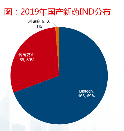 2019年,国产IND数量达到235个,其中,创新型Biotech公司合计申报163项IND,占比达69%;传统药企申报69项,占比30%。