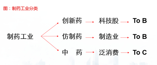 过去市场将制药公司统一归类为大消费股,但随着创新药产业崛起和仿制药带量采购,这一观念正在逐渐发生变化。我们认为:创新药是科技股,仿制药是制造业,部分中药属于泛消费,产业各个子板块正在出现价值回归。