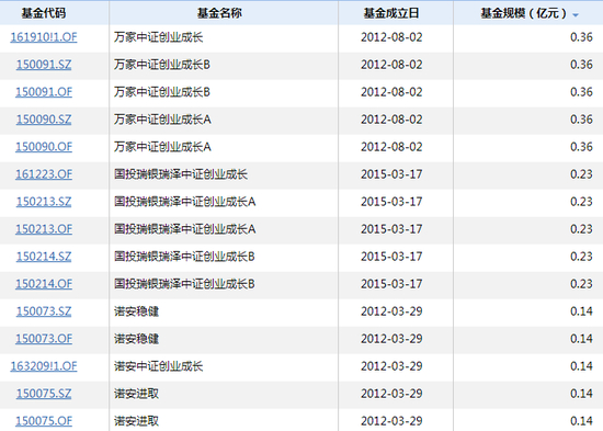 跟踪创业成长(399958)的指数基金,万家、国投瑞银、诺安等产品规模不到5000万元。