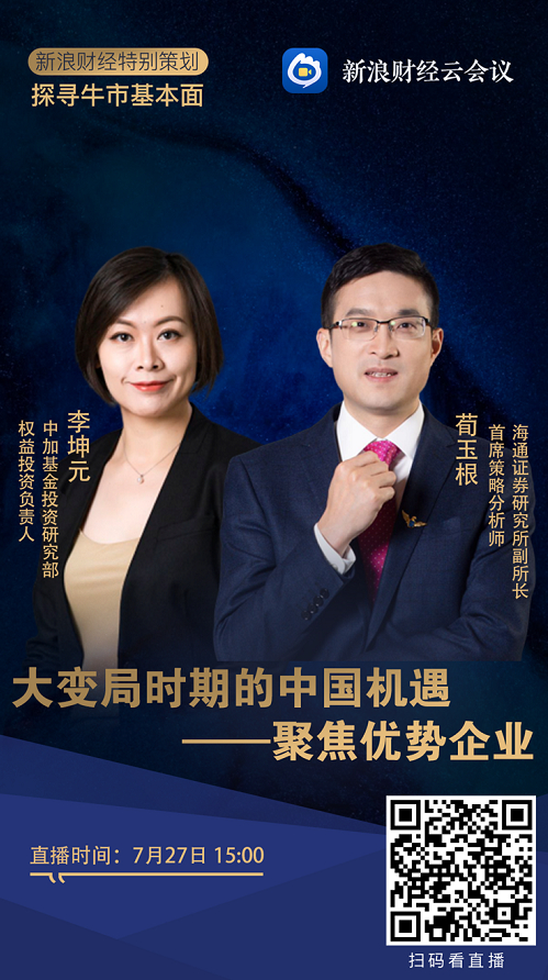 7月27日15:00海通证券研究所副所长、首席策略分析师荀玉根,中加基金投资研究部权益投资负责人李坤元,分享主题:大变局时期的中国机遇——聚焦优势企业。