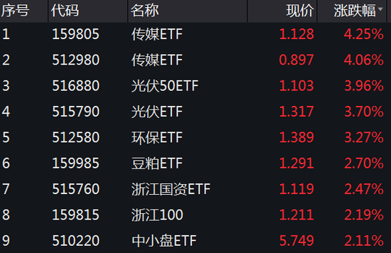 鹏华传媒ETF(159805),广发传媒ETF(512980)涨幅超4%。银华光伏50ETF(516880),华泰柏瑞光伏ETF(515790),广发环保ETF(512580)涨幅超过3%。