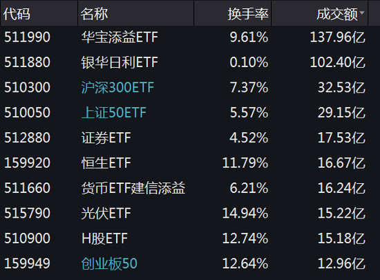 成交额方面,华泰柏瑞沪深300ETF和华夏上证50ETF分别成交35亿元、29亿元,超过了近期热门的国泰证券ETF等行业主题ETF的成交额。