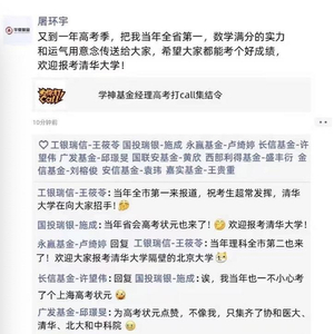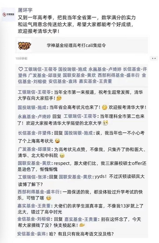 6月8日消息,高考如火如荼举行。基金圈儿学霸基金经理、状元基金经理陆续为莘莘学子们加油助力。“基金经理的朋友圈”截图火了,大咖云集。