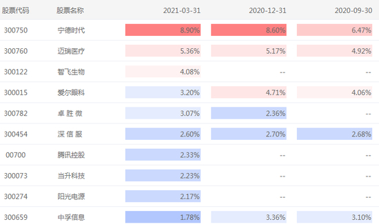 屠环宇持仓状况如下,2021Q1对宁德时代、迈瑞医疗进行加仓,减持了爱尔眼科。