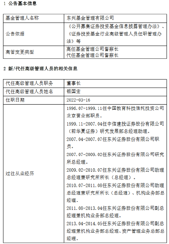3月17日,东兴基金发布高级管理人员变更公告,督察长王微因个人原因离任,董事长银国宏代任代任督察长职务,代任日期2022-03-16。
