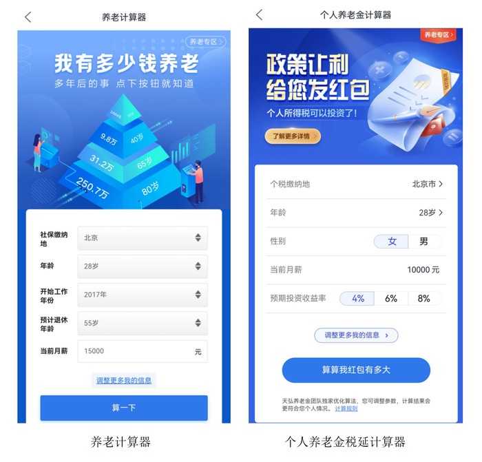 其中“稳健优选”内,为用户提供债券旗舰、口碑固收+、养老专区、避险黄金等四大选择。并主动为用户提供产品升级选项,免去了用户选择困难。不光如此,还为用户提供“投资期限与风险评级”两大类选择,此举最大程度的降低了用户的选择门槛,便利度极高。基金详情页内,标注了基金类型、风险等级、投资者关注度等实用指标。并设有该基金的基金解读与详情两大介绍模块。其中,基金解读页使用图文结合的方式介绍了基金特点与基金经理团队概况,基金详情页中,除了设有业绩走势、盘中表现、单位净值、累计净值等基础行情外,还设有区间涨幅、交易规则、组合信息、运作表现等投资者最为关心的参考指标,可让用户一目了然的了解基金详情。此外,为了助力个人养老金第三支柱建设,赋能个人养老金投资,天弘基金新增养老计算器和个人养老金税延计算器两个工具,投资者只需填几项信息,点击按钮就知道未来个人养老大概需要多少钱、税延未来可能给个人养老金投资带来的增益,以便其能更好的规划自己的养老投资。